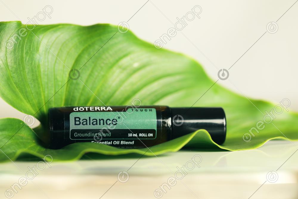 Product image of dōTERRA Balance Roll on with green leaf of white background