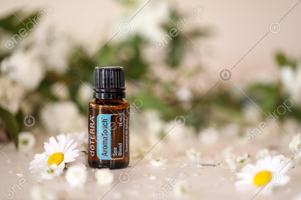 Product photo of AromaTouch on bright background with white flowers