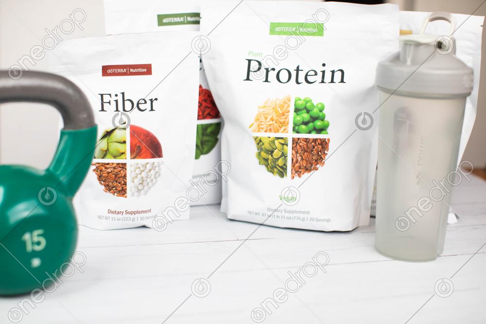 New Protein and nutritional supplements photographed with weight and a blender bottle