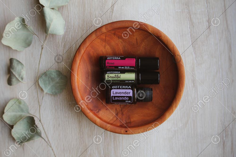 This is a flat lay photo of Rose Touch, Beautiful Touch & Lavender Free essential oil. Share this image on your social media platforms and educate your community on turning to a healthy purefume option.