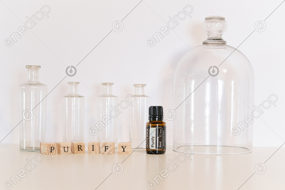 High-resolution image of dōTERRA Purify 15 mL oil bottle on a white background and glass bottles