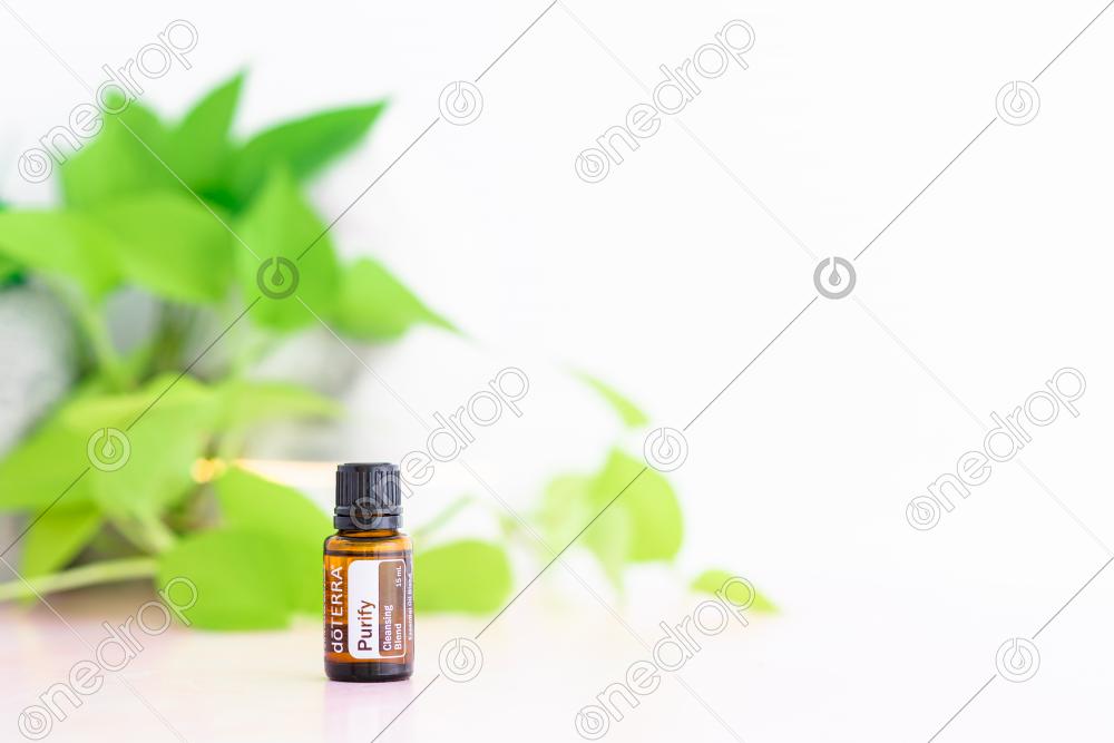 Purify 15 ml Essential Oil on White Background with Plant Leaves
