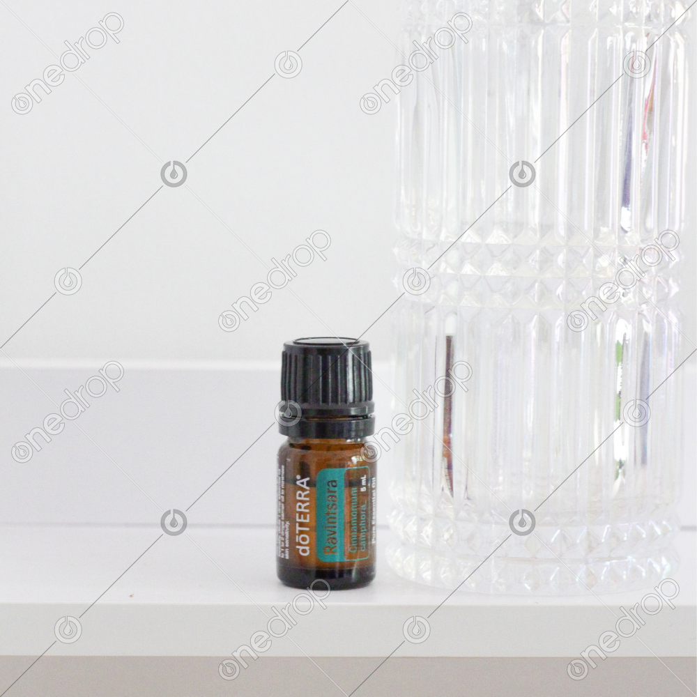 Image of a 5ml Ravintsara oil on a white shelf with a decorative carrier oil dispenser. Files include: a square Instagram post png & a Story post png