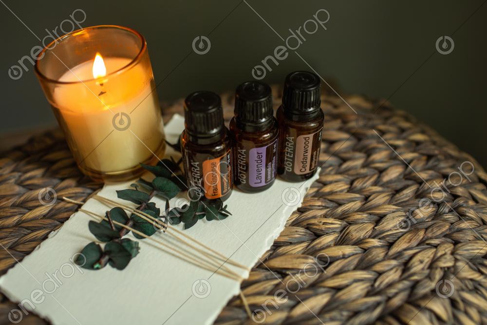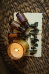 Features the 15mL bottles of each oil , shown on distressed woven wicker, with ripped edge paper tied with Eucalypus, and a burning candle, All the relaxing vibes.