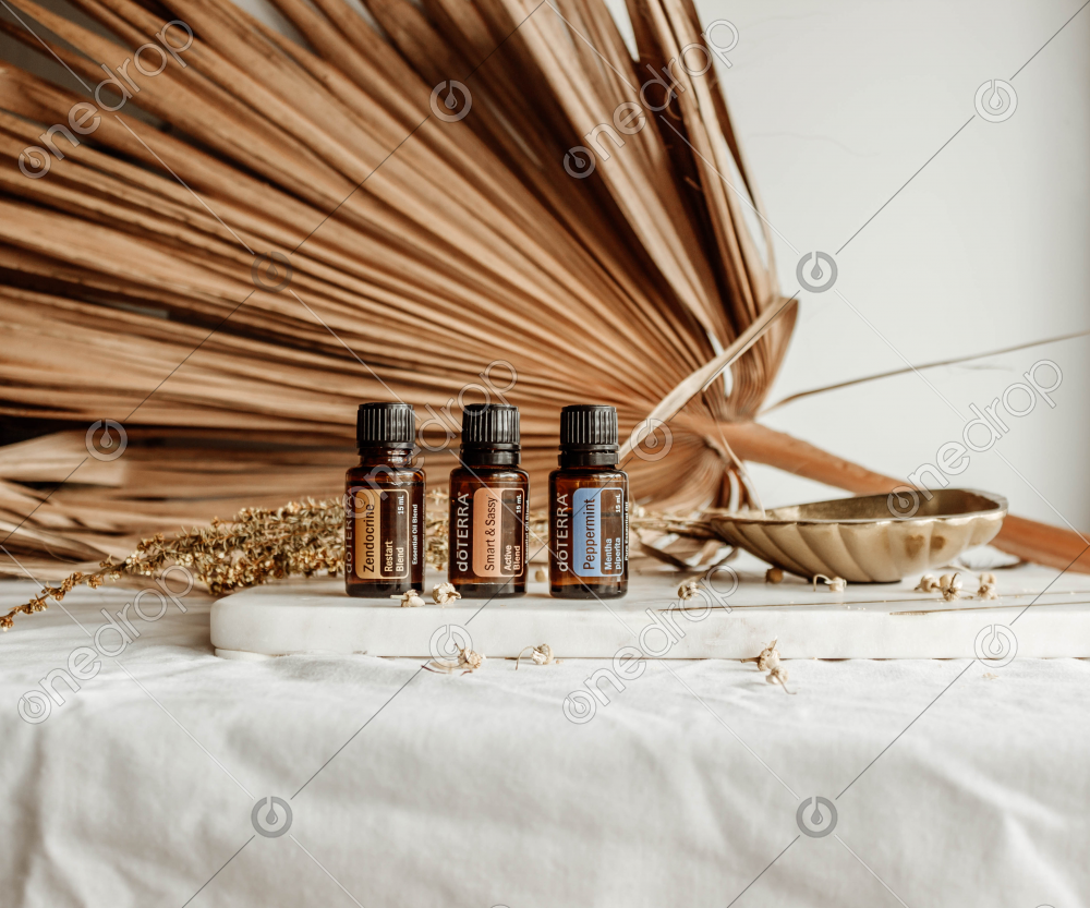 Image of the Reset Bundle (Smart & Sassy, Zendocrine & Peppermint) including Australian and New Zealand specific products, on marble board with dried flowers and dried palm leaf. Natural, bright, warm.