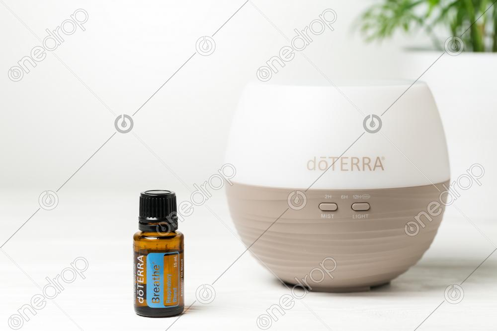 Respiratory Blend Breathe, essential oil blend on Petal Diffuser background, copy space