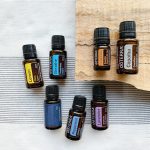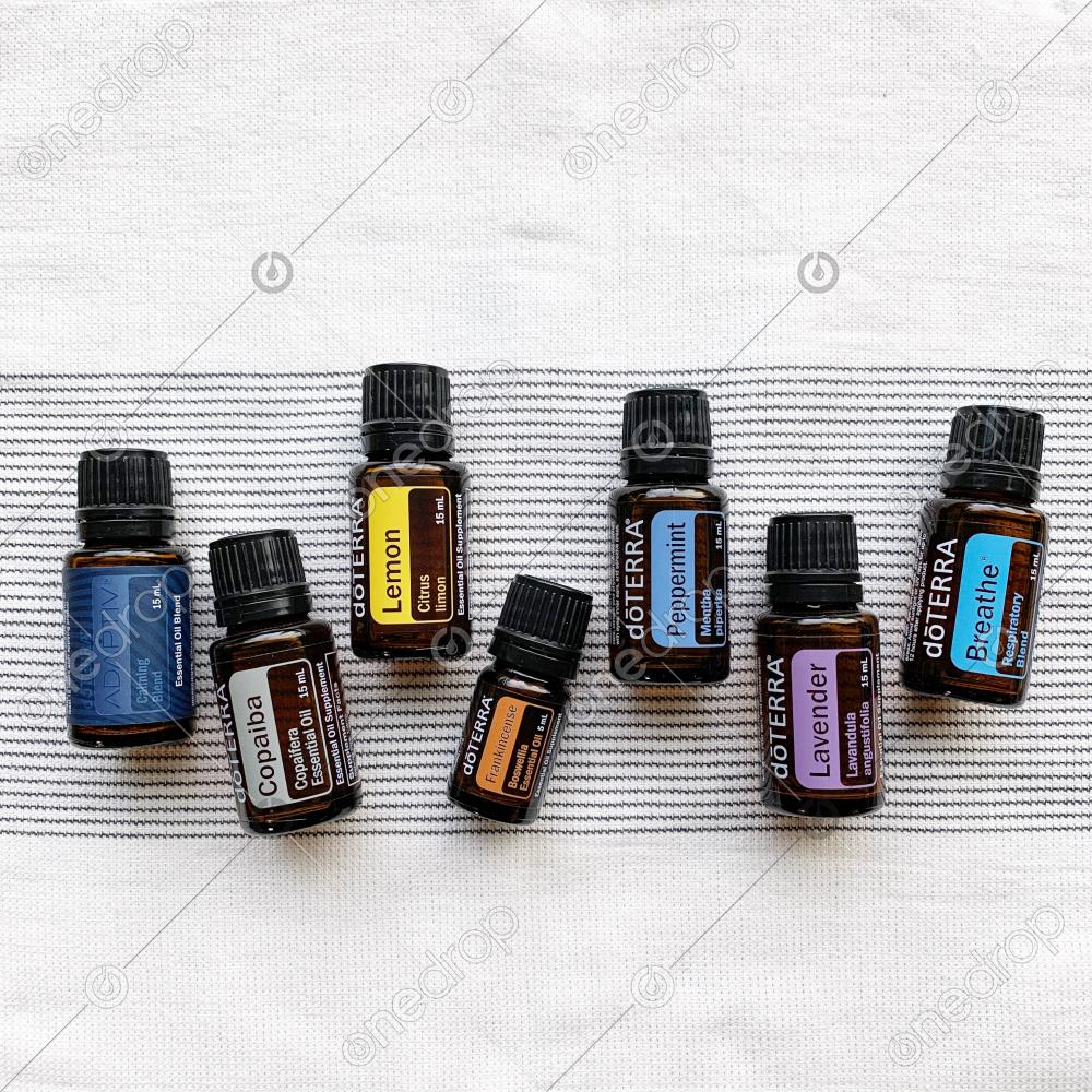 Features the Oils in the NEW RESPOND KIT in a Flat Lay. Includes: Adaptiv, Copaiba, Lemon, Frankincense (5ml), Peppermint, Lavender & Breathe.