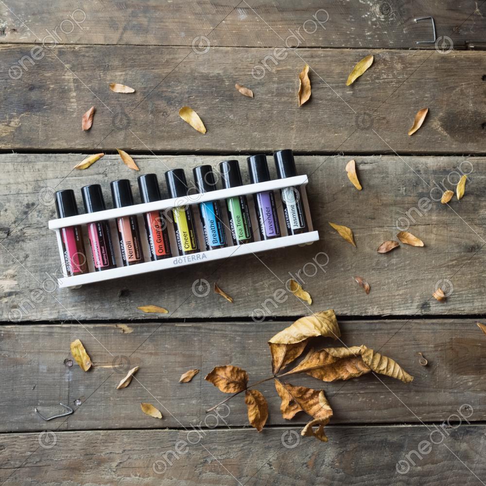 Roll-on/Touch Oils in doTERRA stand on layflat with fall theme - 3 Image Variations
