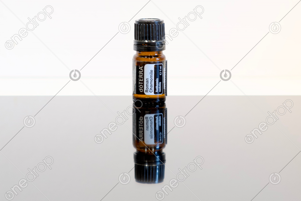 High-resolution photo with Roman Chamomile 15mL oil bottle on a mirrored surface.