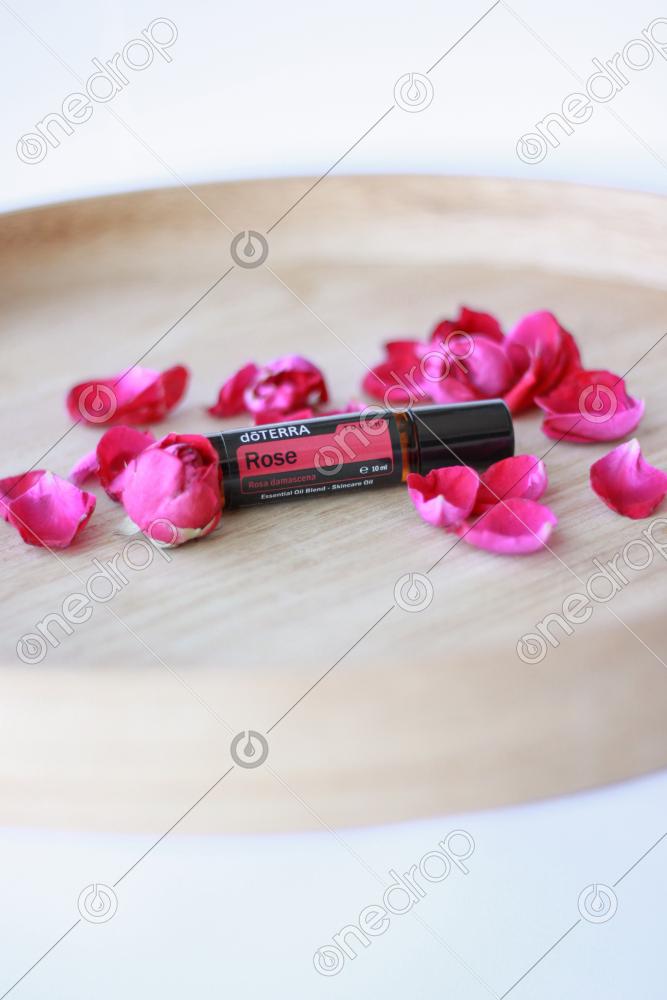 doTERRA Rose Touch 10ml on a wooden plate with rose flower and pink rose petals.