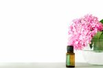 Rosemary 15ml Essential Oil Bottle on White Background with Hydrangea Flower