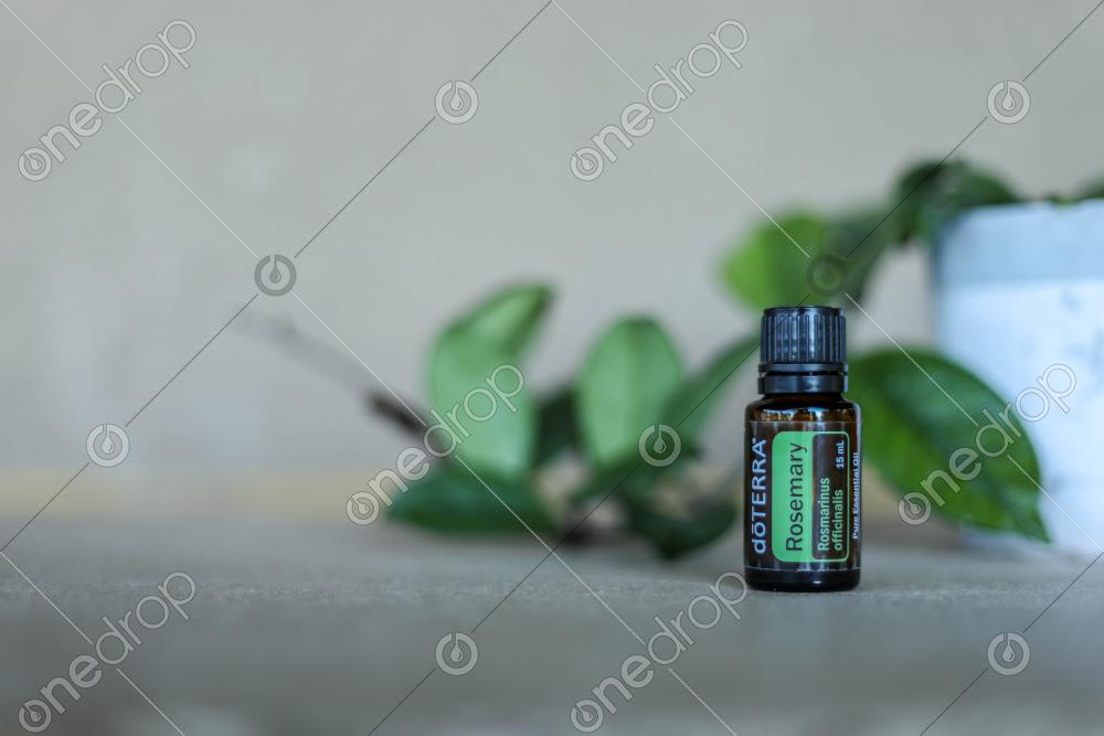 Rosemary 15ml essential oil image on simple background with small plant