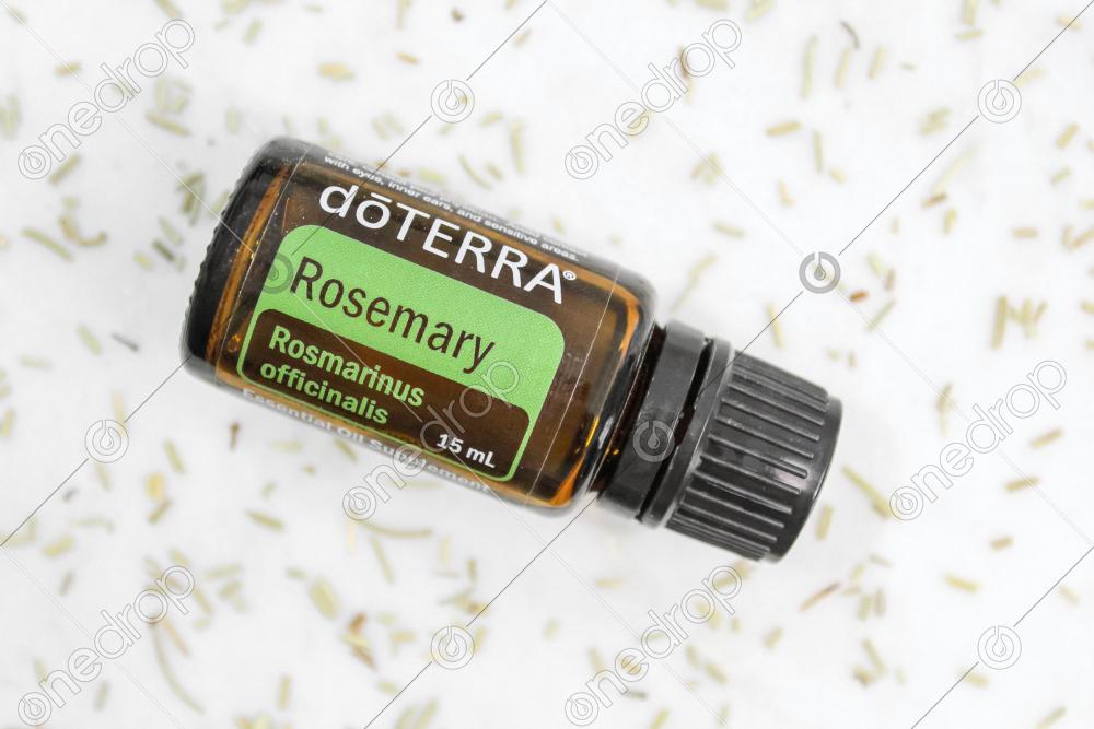 This high resolution image features a bottle of Rosemary oil. The background is a marble cutting board with a generous sprinkle of dried Rosemary.