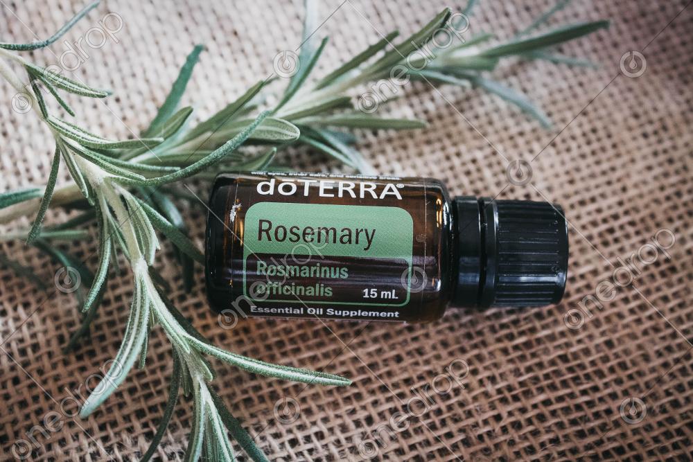This photo features a 15 ml bottle of Rosemary with fresh rosemary on a burlap background