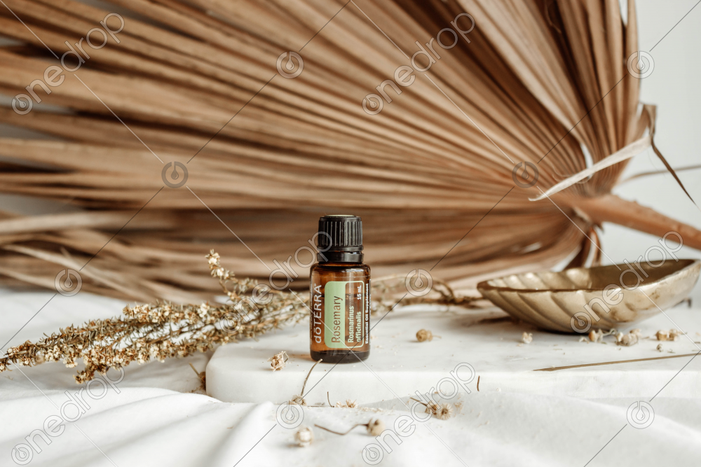 Photograph of the Rosemary 15ml standing on marble board with dried flowers and dried palm leaf. Light and airy.