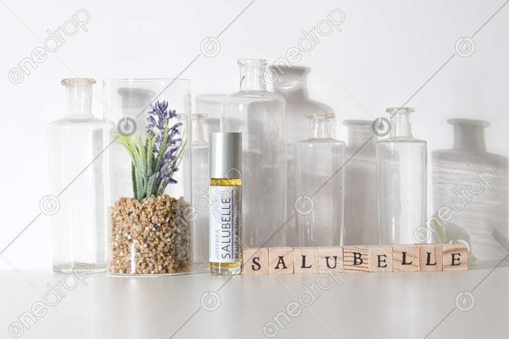 High-resolution image of Salubelle 10 mL roll-on on a white background and glass bottles