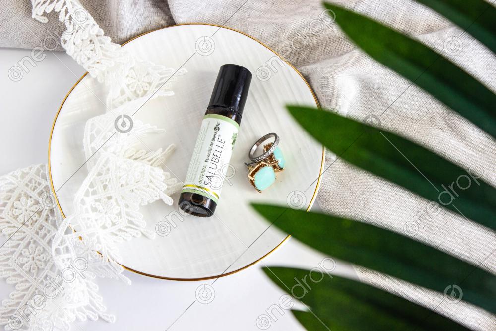 Bright photograph of Salubelle placed on a dish beside jewellery. Horizontal orientation with room for text if desired.