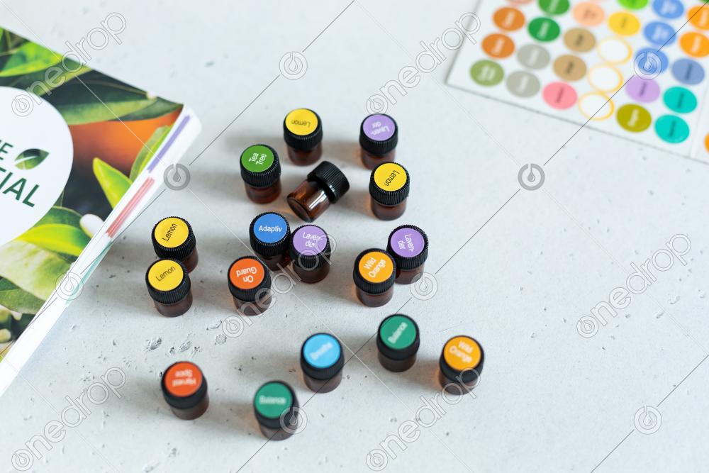 Sample bottles 1 ml with top essential oils and learning guides book on white background