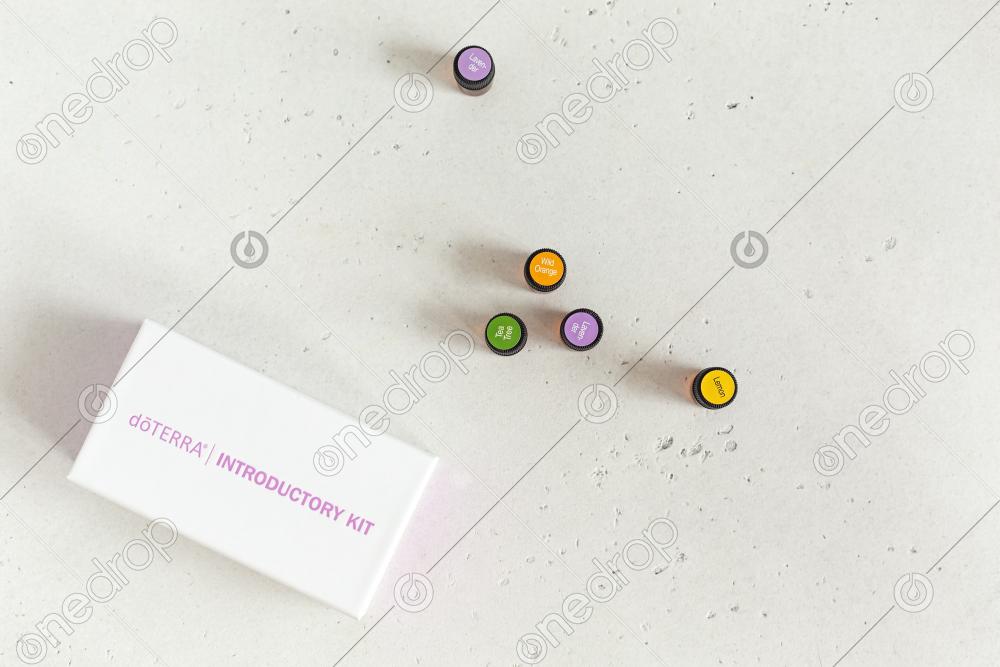 Sample drams with top essential oils and Introductory Kit box, top view