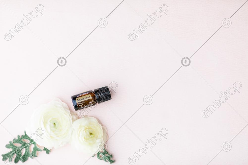 Sandalwood 5 ml on pink background with white flowers and leaves. Blank space can be used to add text or high resolution image can be cropped creatively for Instagram, Facebook, or social media.
