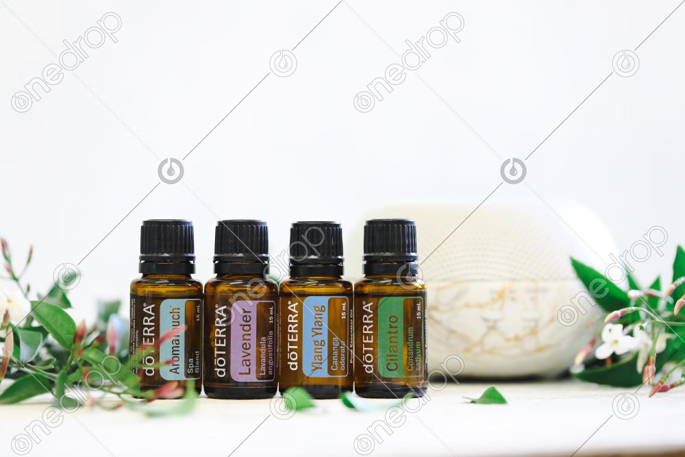 High resolution image of a selection of essential oils with diffuser on white background with copy space