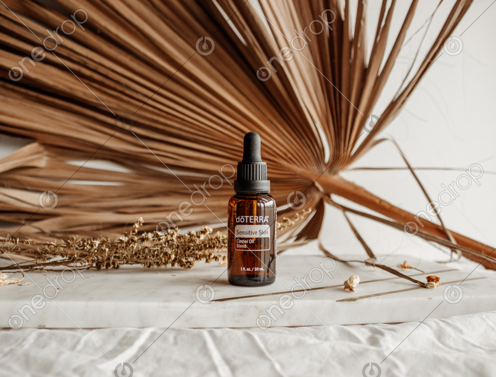 High Res image of Sensitive Skin Carrier Oil Blend standing on a marble board with dried palm leaf in background.