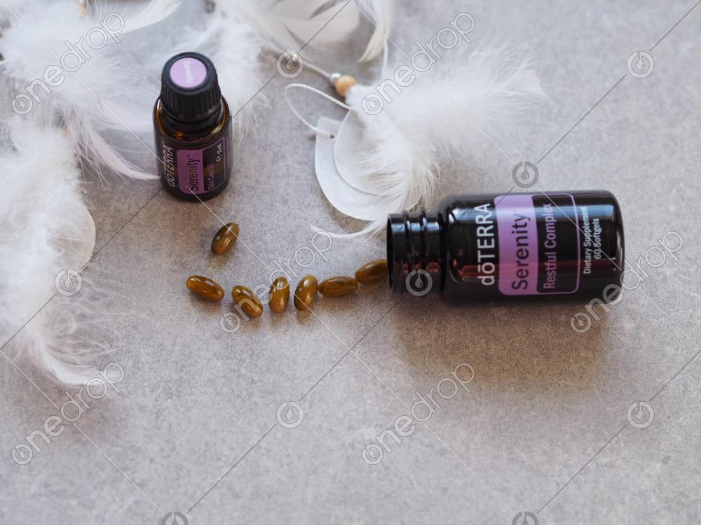 Neutral, natural and light image of Serenity essential oil blend and softgels with white feathers on flat grey tabletop. Plenty of room for your own copy. Use to promote natural lifestyle or Serenity products. Suitable for social media, website, blog or email banner.