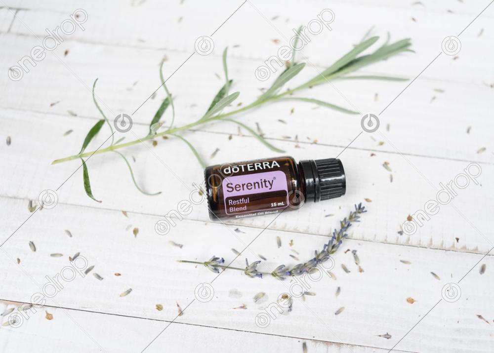 dōTERRA Serenity Restful Blend on white wood with greenery - 4 image variations
