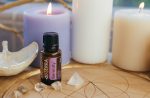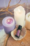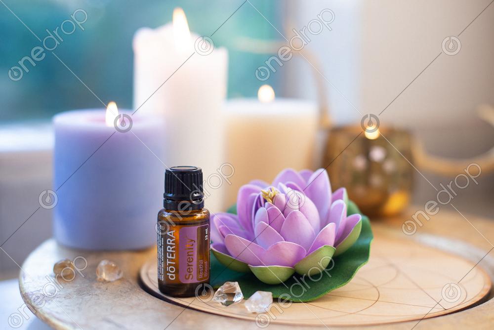Serenity displayed in relaxing setups with candles, crystals, and a purple lotus flower.