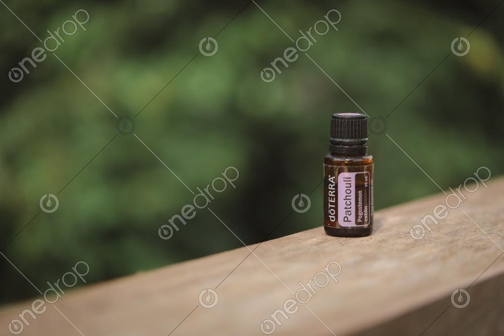 Two high resolution images of Patchouli - The Oil of Physicality - 15ml bottle on wood with natural green background