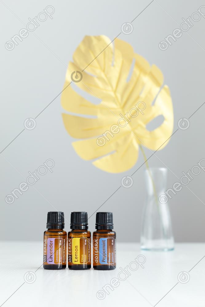 Set of top must have essential oils - Lavender, Peppermint and Lemon on white table in interior