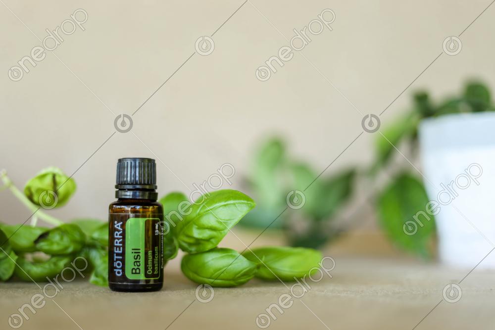 Simple image of Basil essential oil with fresh basil plant