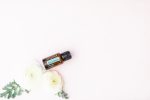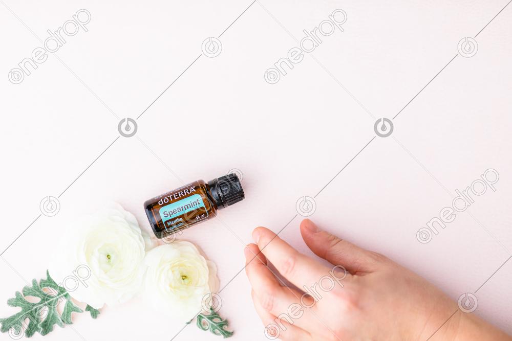 Spearmint Essential Oil on pink background with white flowers and leaves. Blank space can be used to add text or high resolution image can be cropped creatively for Instagram, Facebook, or social media.