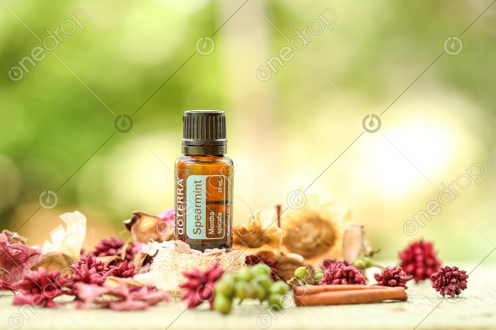 Spearmint in vibrant outdoor setting surrounded by dried flowers with copy space