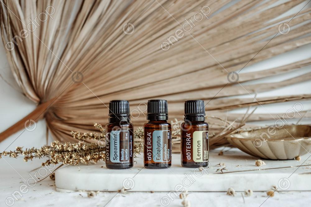 High Res image of Spearmint, Lemon & Eucalyptus standing on a marble board with Lumo diffuser, dried palm leaf in background.