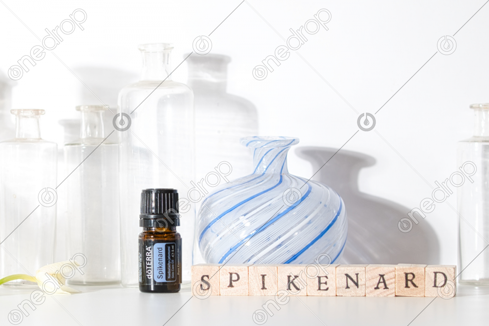 High-resolution image of Spikenard 5 mL oil bottle on a white background and glass bottles