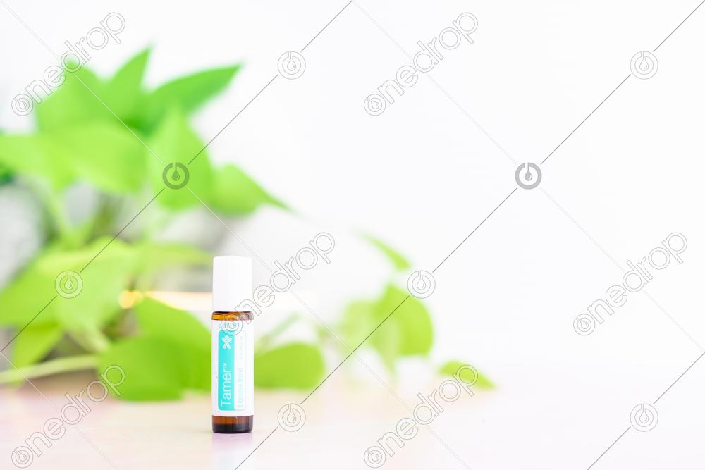 Tamer™ 10ml Roller Bottle Essential Oil on White Background with Plant Leaves