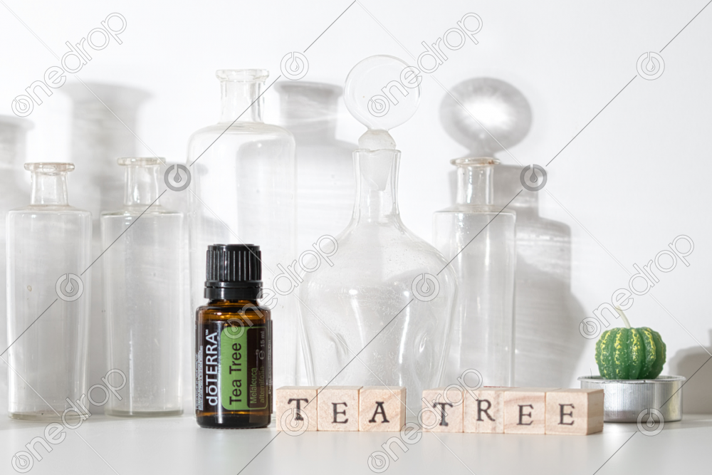 High-resolution image of Tea Tree 15 mL oil bottle on a white background and glass bottles