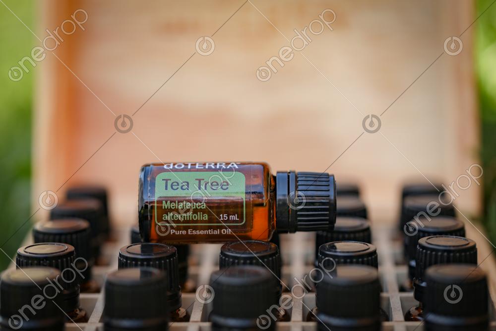 dōTERRA Tea Tree displayed on full wooden storage box of oils