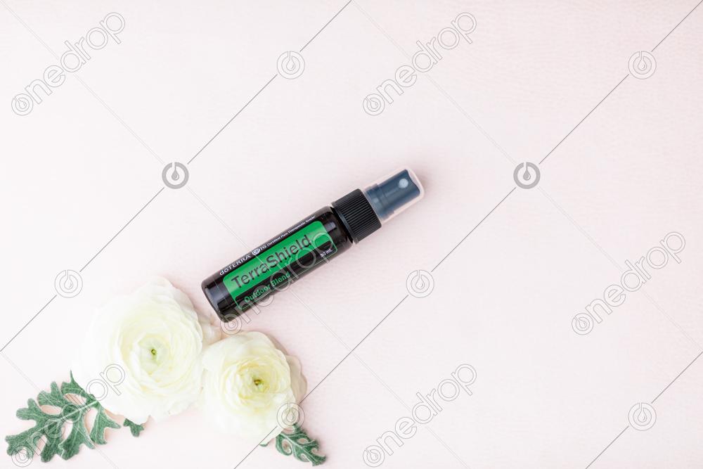 TerraShield® Spray on pink background with white flowers and leaves. Blank space can be used to add text or high resolution image can be cropped creatively for Instagram, Facebook, or social media.