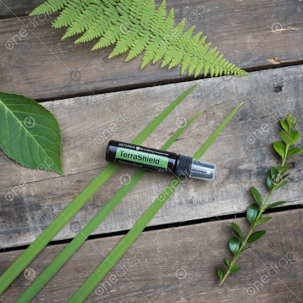 TerraShield Spray on rustic wood with greenery