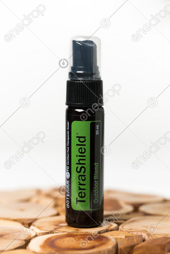 TerraShield spray Outdoor Blend on wooden natural tray with white background, copy space