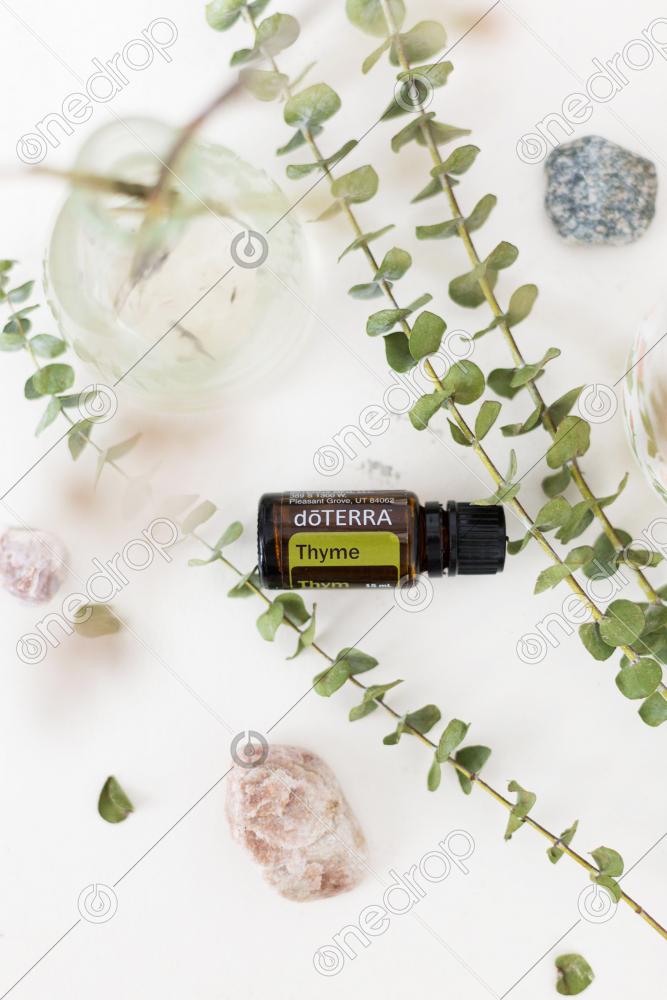 High resolution photograph of Thyme essential oil which is commonly used in cooking. Earthy, rustic and boho style flat lay of essential oils on a rustic white table with rocks, vases, dried flowers and greens.