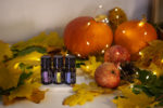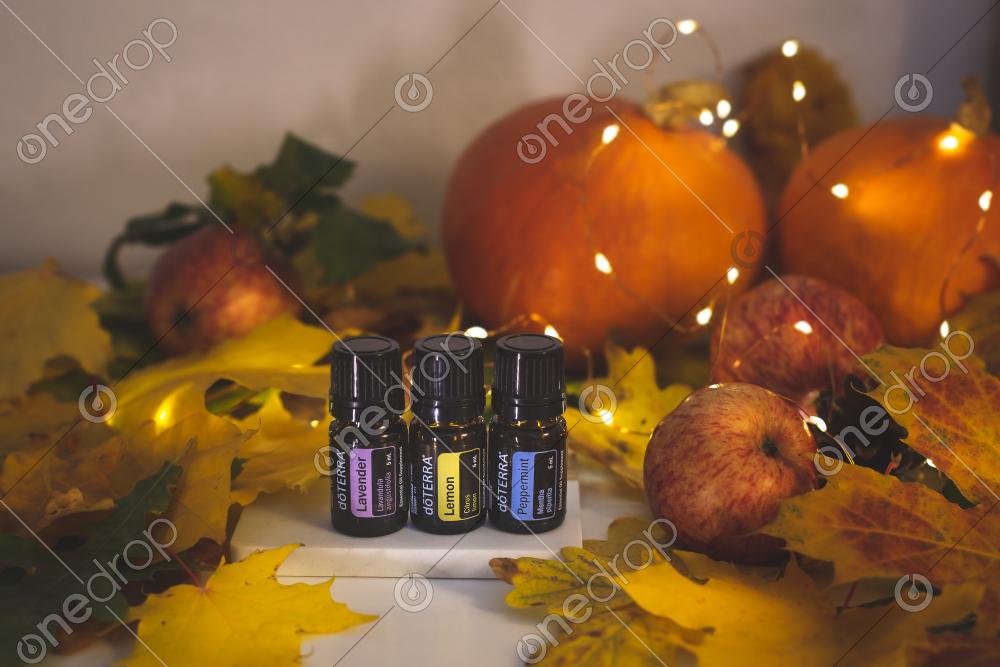 Top 3 essential oils, bottles 5 ml with Peppermint, Lavender and Lemon at fall decoration with leaves and pumpkins