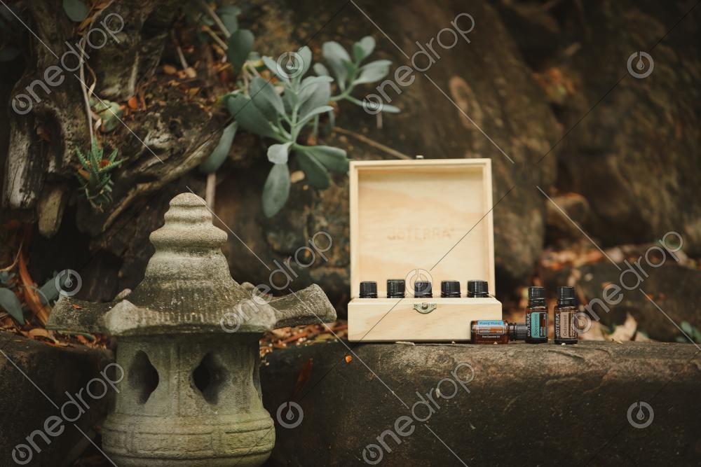 Tranquil scene with bamboo doTERRA storage box and Ylang Ylang, Spearmint and Cedarwood on display