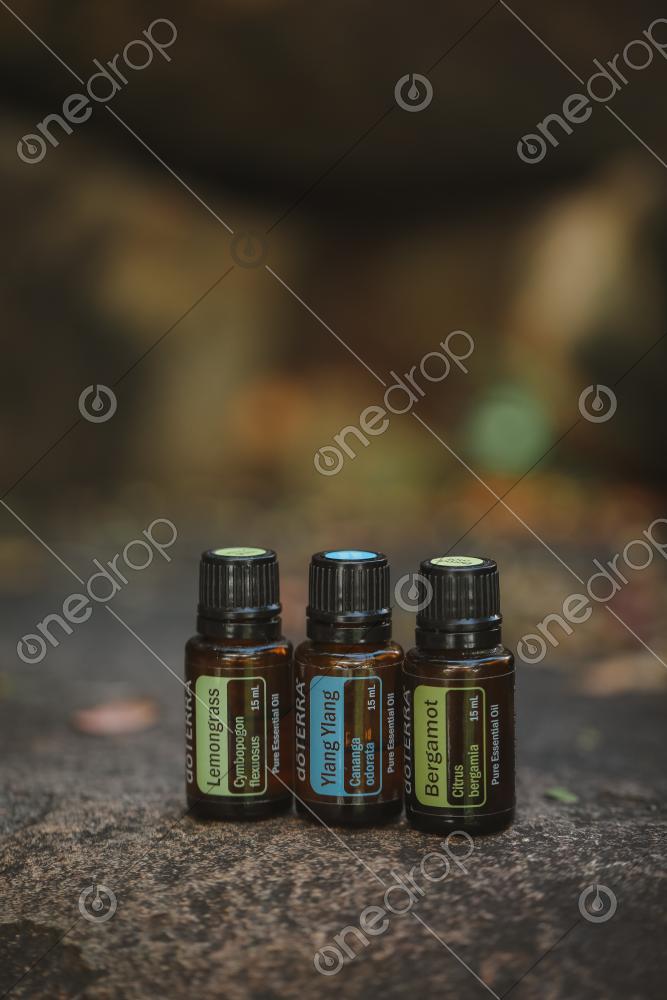 A high resolution image of a trio of Oils - Lemongrass, Ylang Ylang, Bergamot in a natural setting.