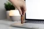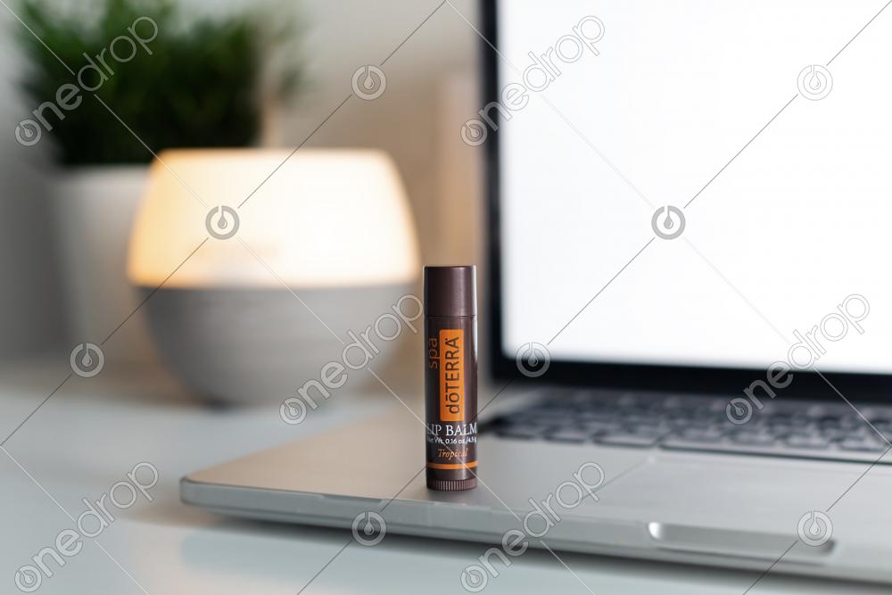 SpaTropical Lip Balm on open laptop with blurry diffuser Petal on background, beauty care for hydrate lips at work place