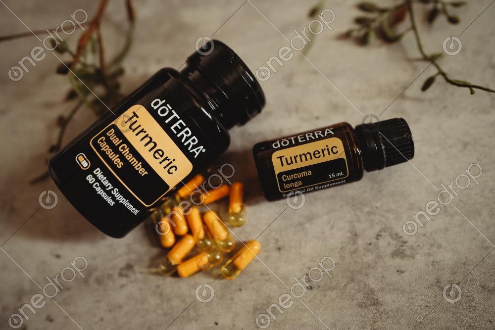 Warm, Earthy Styled Image: Turmeric Dual Chamber Capsules & Turmeric Essential Oil