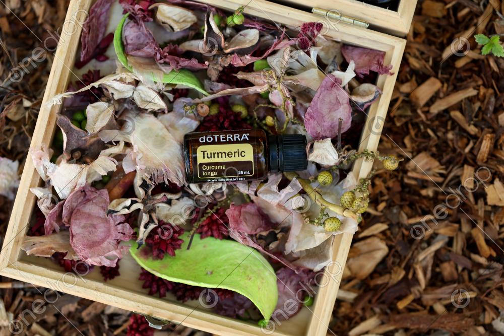 Tumeric in wooden box filled with pretty dried flowers and leaves