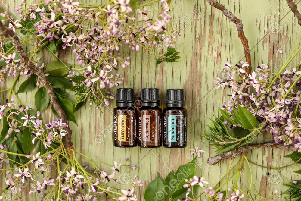 Tumeric, Spearmint and Cedarwood flat lay on painted wood surrounded by purple flowers